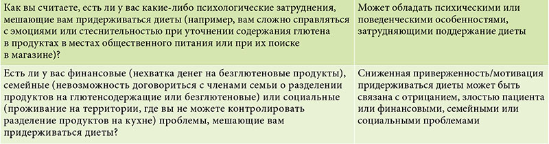 Одновременно D.A. Leffler и соавт. изучили факторы приверженности БГД. Эти факторы включали в себя: понимание сути БГД, наличие поддержки со стороны пациентского сообщества, осознание пациентом способности придерживаться диеты в поездках, при колебаниях настроения или при стрессовых событиях [8]. На основании данного исследования была разработана усовершенствованная версия методики – «Стандартизированная диетологическая оценка (Standardized Dietitian Assessment) приверженности безглютеновой диете», включающая, помимо оценки приверженности диете и способности пациентов распознавать продукты питания, содержащие глютен, информацию о потенциальных причинах неспособности придерживаться БГД. Данная методика получила название «Стандартизованная диетологическая оценка» (СДО) и осуществляется специалистом при помощи интервью [9].