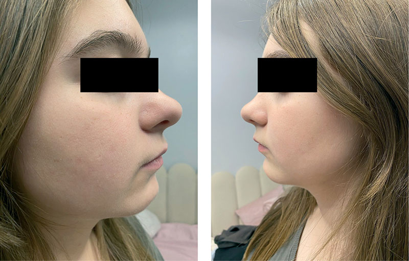 Пациентка П., 12 лет, обратилась с жалобами на высыпания на коже лица, которые вызывали у нее сильное психоэмоциональное переживание. Считает себя больной в течение года. Самостоятельно применяла косметические средства для лечения акне из масс-маркета, без эффекта. При осмотре на коже лица обнаружены множественные открытые и закрытые комедоны, воспалительные папулы, единичные эрозии, которые возникали после того, как пациентка самостоятельно удаляла периодически возникающие пустулезные элементы (рис. 3). Пациентке был назначен специальный уход за кожей, диета, Клензит-С, косметические чистки лица. На фоне проводимой терапии, через 21 день, отмечалось практически полное разрешение высыпаний (рис. 4). Нежелательных побочных эффектов не возникло, переносимость терапии была хорошей. Психоэмоциональное состояние пациентки нормализовалась, что способствовало высокой приверженности к назначенному лечению.