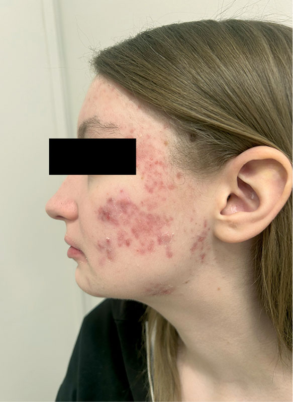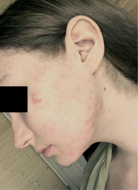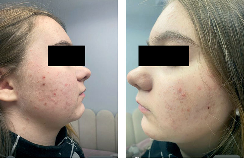 Пациентка Р., 20 лет, обратилась с жалобами на высыпания на коже лица. Считает себя больной с 13-летнего возраста, когда появились первые воспалительные элементы на коже. При осмотре: преимущественно на коже в височно-щечных областях локализованы открытые и закрытые комедоны, множественные папулы застойно-красного цвета, единичные пустулы, на основании чего выставлен диагноз «акне папуло-пустулезные». Ранее пациентка лечилась топическими антибиотиками, азелаиновой кислотой с улучшением, но без выраженного стойкого клинического эффекта. Нами был назначен изотретиноин, стартовая доза – 40 мг, куммулятивная доза – 102 мг/кг. На фоне лечения наблюдалось полное разрешение высыпаний, однако спустя 15 месяцев после отмены изотретиноина пациентка обратилась вновь по причине возникновения единичных папуло-пустулезных высыпаний. При сборе анамнеза оказалось, что у пациентки дисменорея на протяжении последних семи месяцев. Кроме этого, пациентка сообщила, что она не наблюдалась у стоматолога на протяжении последних трех лет. Ей были рекомендованы консультации соответствующих специалистов, по результатам которых назначен прием комбинированных оральных контрацептивов с антиандрогенным эффектом, а также начато стоматологическое лечение. С учетом предшествующего лечения изотретиноином и наличия папуло-пустулезных элементов для лечения высыпаний на коже был назначен Клензит-С микросферы и специальный увлажняющий уход с применением средств лечебной косметики. Спустя 14 дней от начала терапии было отмечено значительное уменьшение воспалительных высыпаний на коже. Выраженных нежелательных побочных эффектов выявлено не было. В настоящее время пациентка продолжает назначенную терапию (рис. 1, 2).