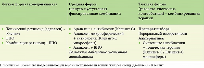 Алгоритм терапии акне, отражающий место фиксированных комбинаций адапалена с клиндамицином, включая инновационную форму Клензит-С микросферы, на основании современных клинических рекомендаций и клинических наблюдений представлен в таблице.