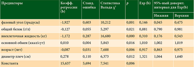Таблица 2. Сводные данные по предиктивной регрессионной модели нутритивной недостаточности на основании антропометрических и биоимпедансометрических показателей для больных раком пищевода