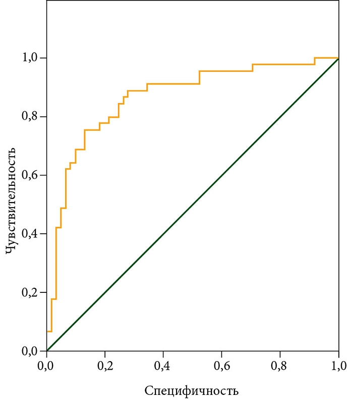 По результатам построения ROC-кривой показатель AUC составил 0,864 ± 0,037 (95% ДИ 0,792–0,937; р < 0,001) (рисунок).