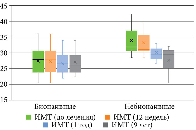 На фоне терапии гуселькумабом отмечалось снижение показателя ИМТ в обеих группах в срок 52 недели и данная динамика сохранялась на протяжении 468 недель.