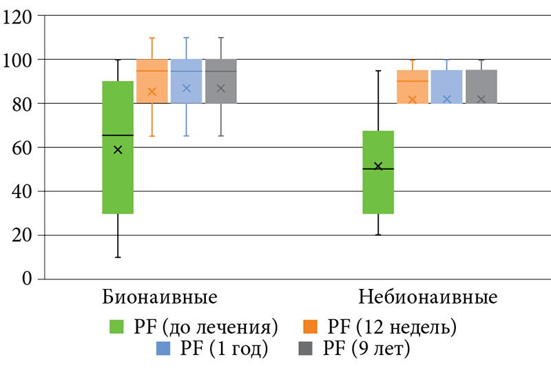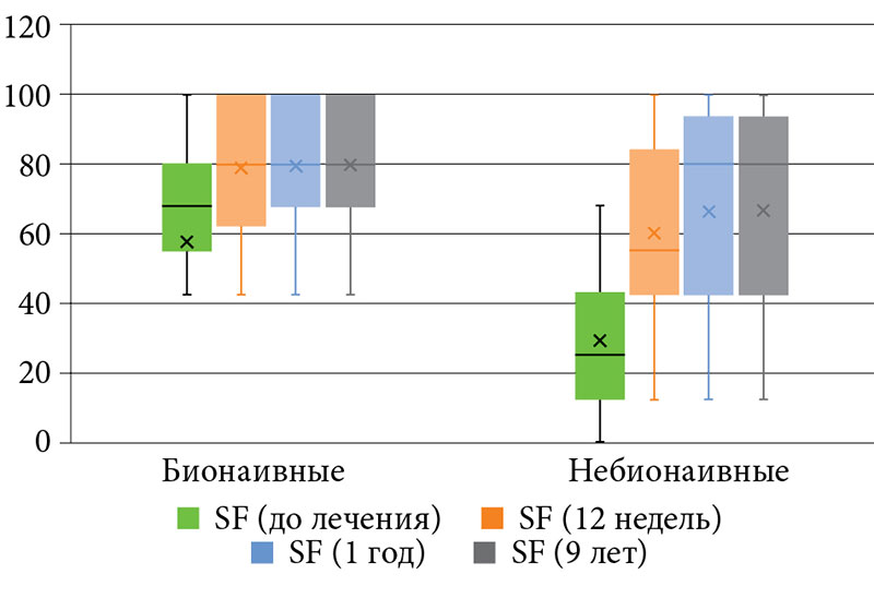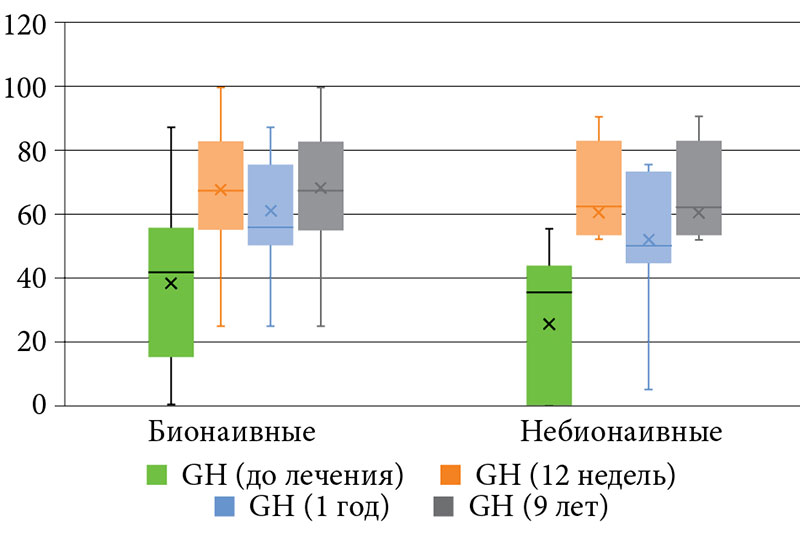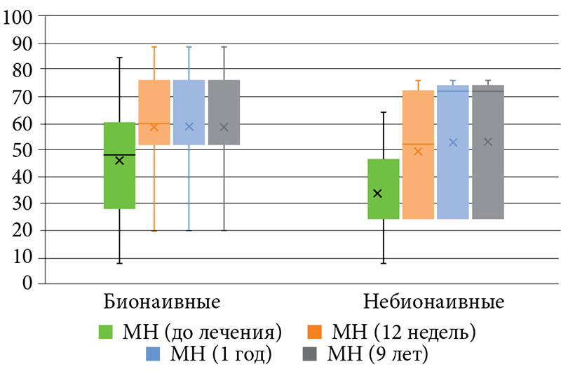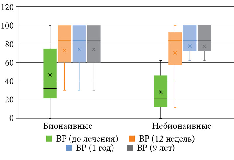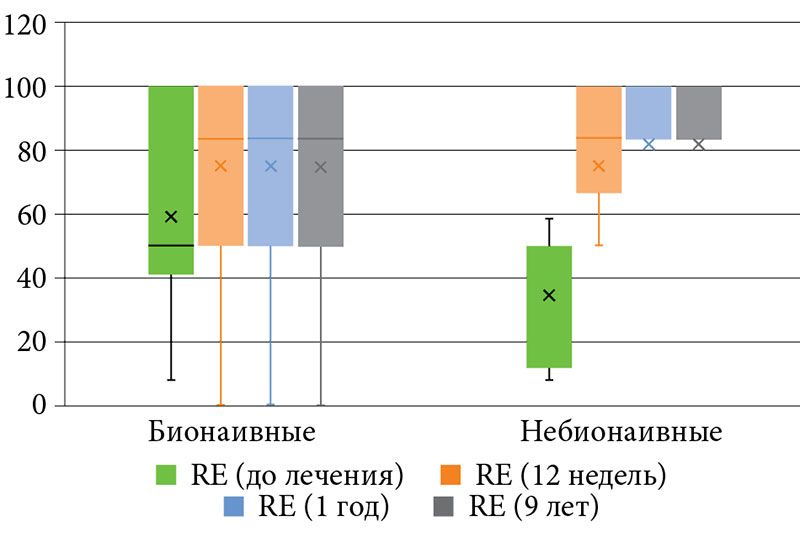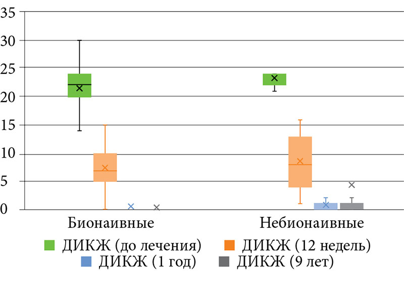 Оценку качества жизни больных псориазом проводили до назначаемой терапии и на 12, 24, 52-й и 468-й неделях лечения.
