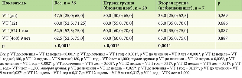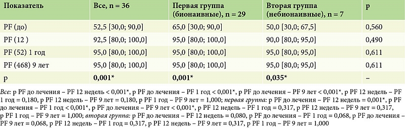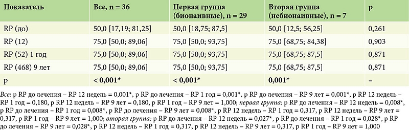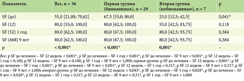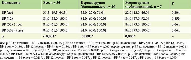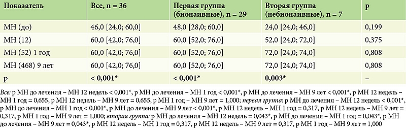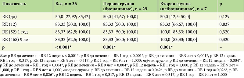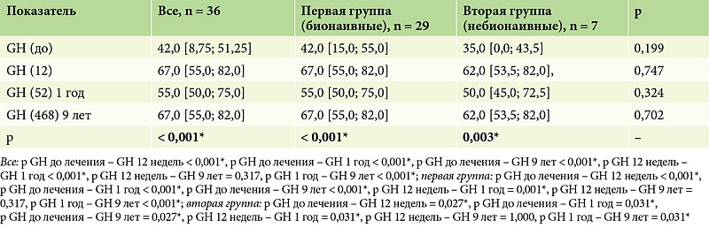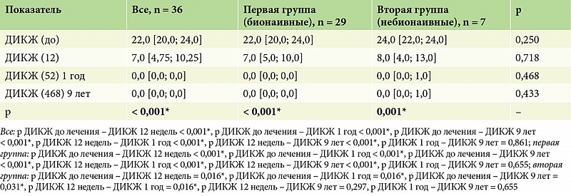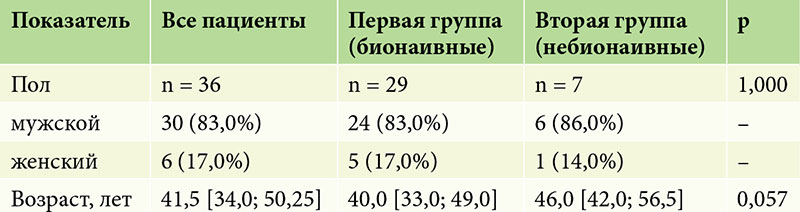 По данным предшествующей терапии, пациенты были разделены на две группы. Первую группу составили 29 (80%) пациентов, у которых биологическая терапия была первой линией терапии (бионаивные), из них 24 (83,0%) мужчин и 5 (17,0%) женщин, средний возраст – 40,0 [33,0; 49,0] года. Во вторую группу вошли 7 (20%) пациентов, из них 6 (86,0%) мужчин и одна (14,0%) женщина, средний возраст – 46,0 [42,0; 56,5] года, у которых назначенная биологическая терапия была второй линией терапии. Пациенты групп статистически значимо (p > 0,05) не различались по полу и возрасту (табл. 1).