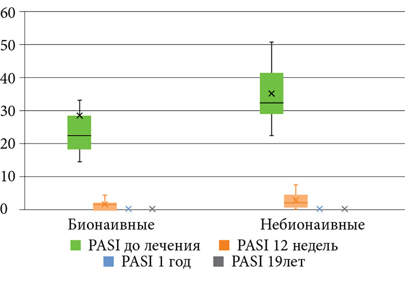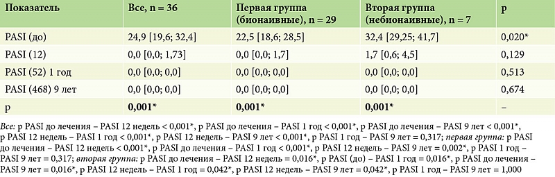 Эффективность терапии оценивали по динамике показателей PASI, BSA, sPGA, NSR, ДИКЖ и SF-36. Также были сделаны цифровые фотографии больных до начала и после окончания терапии.