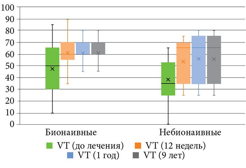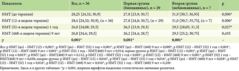 В процессе наблюдений было показано, что эффект, достигнутый в срок 52 недели, сохранялся на протяжении 468 недель (табл. 3, рис. 2).