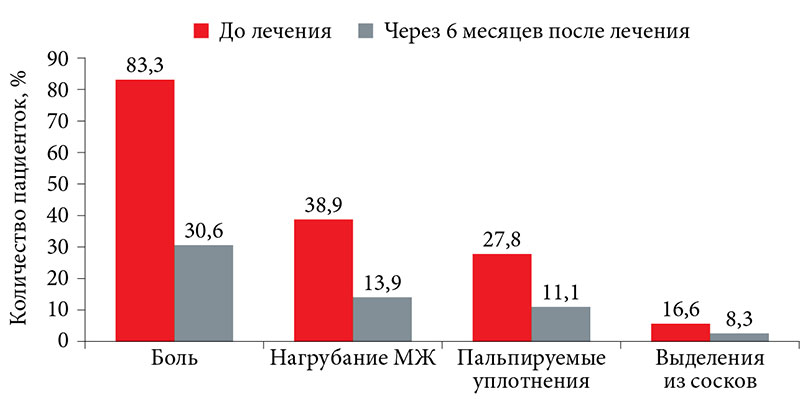 Консервативная тактика лечения доброкачественной дисплазии МЖ предусматривала использование микронизированного прогестерона на протяжении шести месяцев. Оценивая эффективность проведенного лечения, необходимо отметить значительное снижение числа жалоб пациенток (рисунок).