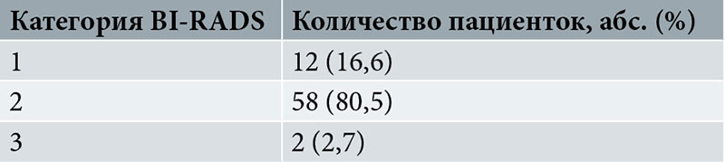 Таблица 2. Распределение пациенток в соответствии с категориями ACR BI-RADS