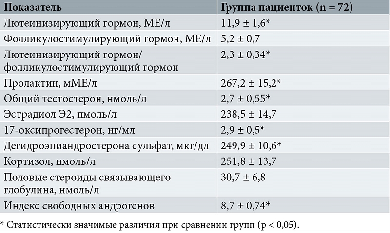 Основная мотивация обращения пациенток исследуемых групп была связана с нарушением генеративной функции: невынашиванием беременности – 61 (84,7%) пациентка, вторичным бесплодием – 20 (27,7%), первичным бесплодием – 52 (72,2%). Нарушение менструального цикла отмечалось у 66 (91,7%) пациенток (аменорея – 30,6%, дисменорея – 50,0%, олигоменорея – 8,3%), гирсутизм – у 62 (86,1%). При этом женщинам с нарушением менструальной функции и андрогензависимыми дерматопатиями проводилось лечение КОК с антиандрогенной зависимостью (этинилэстрадиол и дроспиренон) на протяжении всего периода наблюдения.