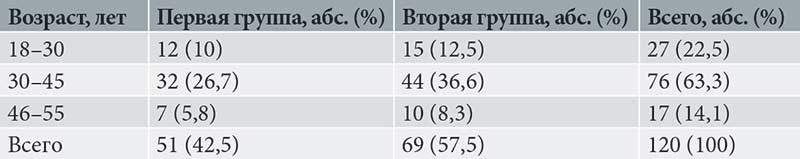 Изучены данные 120 пациенток. Средний возраст женщин составил 33 ± 6 лет (табл. 1). Мастопатия в анамнезе выявлена у 27 (22,5%) женщин в возрасте 18–30 лет, у 76 (63,3%) – в возрасте 30–45 лет, у 17 (14,2%) – в возрасте 46–55 лет. Было сформировано две группы. Первую составила 51 (42,5%) пациентка с ДДЗМЖ без нарушений функции щитовидной железы, вторую – 69 (57,5%) пациенток с ДДЗМЖ и нарушенным тиреоидным статусом.