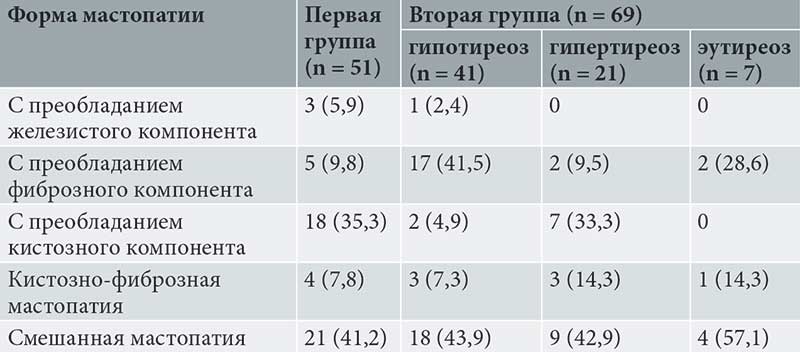 Results. In the first group (n = 51; 42.5%), the patients had no history of thyroid dysfunction. In patients of the second group (n = 69; 57.5%), hypothyroidism was detected – 41 (59.4%) cases, hyperthyroidism – 21 (30.4%), euthyroidism – 7 (10.2%) cases. Fibrotic and mixed forms of mastopathy prevailed among patients with hypo- and euthyroid thyroid pathology – 41.5 and 42.9% in the group with hypothyroidism and 28.6 and 57.1% in the group with euthyroidism. Thyrotoxicosis was dominated by mixed (42.9%) and cystic (33.3%) forms of mastopathy. In women without thyroid pathology, mastopathy with a predominance of cystic (35.3%) and mixed (41.2%) components was more common.