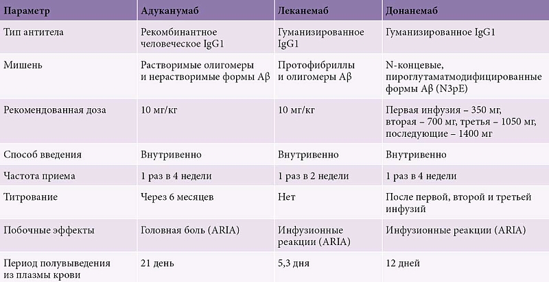 Сравнительная характеристика антиамилоидных моноклональных антител, одобренных FDA, представлена в таблице [33, 34].