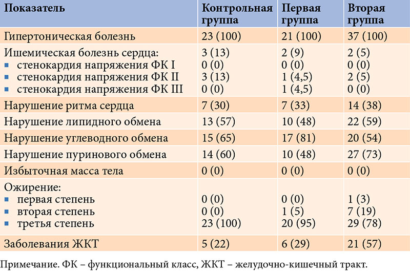 Анализируемые группы были сопоставимы по всем исходным характеристикам. Не было выявлено статистически значимых различий между группами по возрасту, антропометрическим данным, показателям биоимпедансометрии и др. Участники исследования не принимали лекарственную терапию, которая могла бы повлиять на результаты исследования, в том числе биологически активные добавки к пище и витамины. Клиническая характеристика больных, включенных в исследование, представлена в табл. 2.