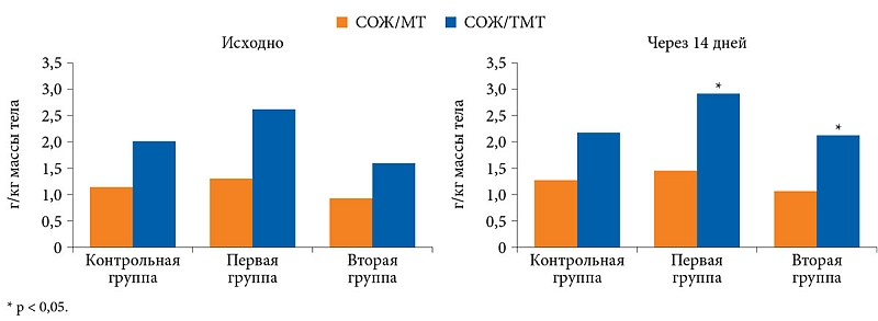 Аналогичная тенденция выявлена при анализе скорости окисления макронутриентов, при этом в наибольшей степени в отношении динамики СОЖ. В частности, у пациентов контрольной группы в результате проведенного курса диетотерапии СОЖ снизилась на 2%, а ее удельные показатели (СОЖ/МТ и СОЖ/ТМТ) повысились на 7 и 10% соответственно. У пациентов первой группы СОЖ повысилась на 3%, СОЖ/МТ и СОЖ/ТМТ – на 11 и 13% соответственно (р < 0,05). У пациентов второй группы СОЖ статистически значимо повысилась на 12% (р < 0,05), СОЖ/МТ – на 17% (р < 0,05), СОЖ/ТМТ – на 30% (р < 0,05) (рис. 1).
