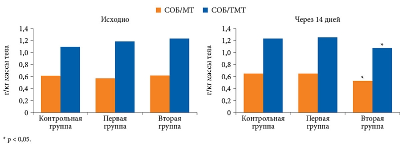 Особо необходимо отметить тенденцию, выявленную при анализе СОБ и ее удельных величин (СОБ/МТ, СОБ/ТМТ). Так, в результате проведенного курса диетотерапии в первой группе и контрольной группе СОБ увеличилась на 2,0 и 2,5%, удельные величины также увеличились на 7 и 3%, 9 и 13% соответственно. У пациентов второй группы диетотерапия способствовала статистически значимому снижению СОБ на 18% (р < 0,05), а СОБ/МТ и СОБ/ТМТ – на 14% (р < 0,05) и 15% (р < 0,05) соответственно (рис. 2). Это свидетельствует о торможении окисления белка, то есть о повышении активности анаболизма белка, и является прогностически благоприятным фактом, направленным на последующее увеличение объема мышечной массы и энерготрат покоя.