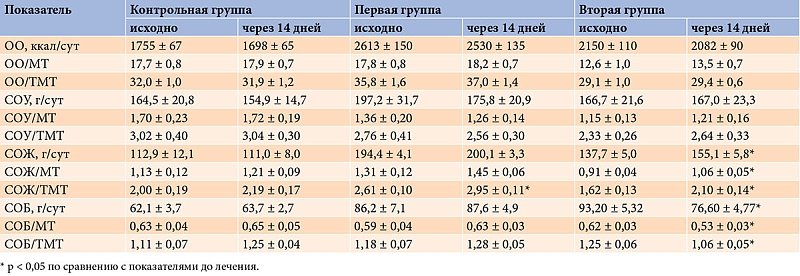 Анализ энергетического обмена методом непрямой респираторной калориметрии показал, что обогащение базисного рациона смесями для ЭП привело к повышению активности энергетического обмена, особенно рассчитанного в условных единицах – отношение основного обмена к массе тела (ОО/МТ) и отношение основного обмена к тощей массе тела (ОО/ТМТ) (табл. 4). Так, у пациентов контрольной группы в результате диетотерапии ОО уменьшился на 3%, а его удельные показатели (ОО/МТ и ОО/ТМТ) остались практически неизменными.