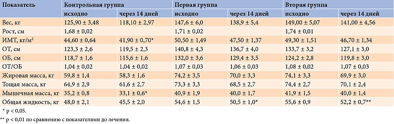 Во всех группах отмечена одинаковая удовлетворительная редукция МТ. Так, за 14-дневный курс лечения у пациентов первой и второй групп масса тела снизилась на 6,0 и 5,3%, у пациентов контрольной группы – на 6,0%. Индекс массы тела уменьшился на 6,0, 5,3 и 6,0% соответственно.