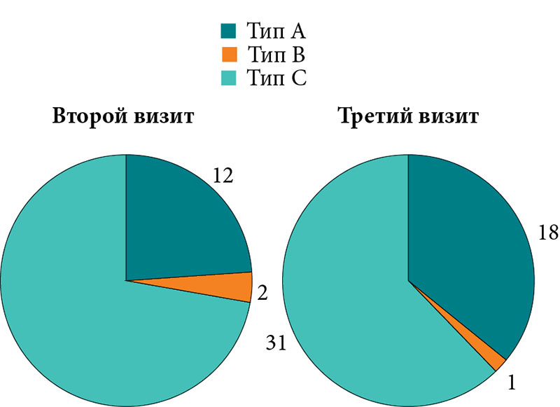 Результаты обследования на третьем визите, а также сравнительная характеристика результатов обследования на втором и третьем визитах отображены в табл. 3 и на рис. 5–8.