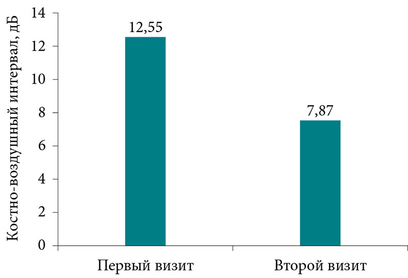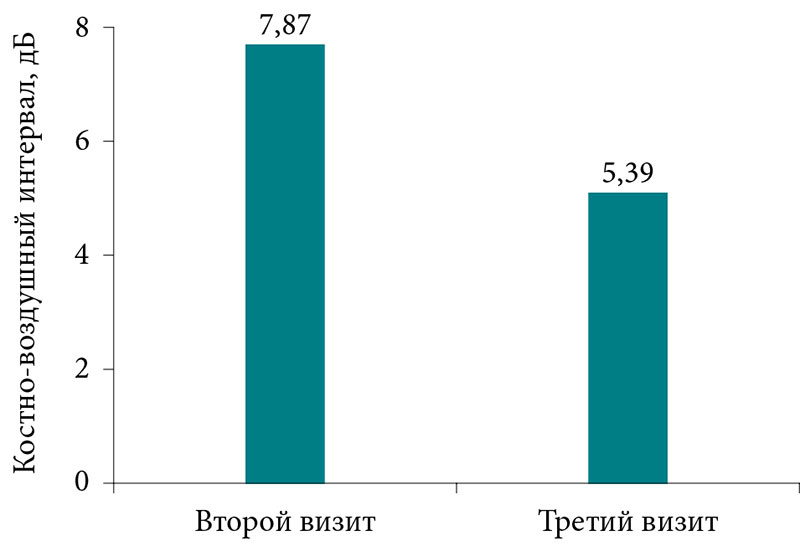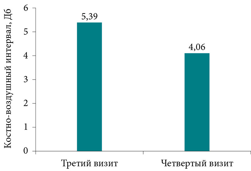 По результатам тимпанометрии тип А выявлен у 41 пациента, тип В – у двух пациентов и тип С – у семи. По результатам тональной пороговой аудиометрии было установлено: у 36 пациентов слух не нарушен (N), у 14 пациентов выявлена кондуктивная тугоухость, среднее значение костно-воздушного интервала для всей группы на визите через год сократилось и составило 4,06 ± 2,4 дБ.