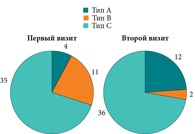 Результаты обследования на втором визите, а также сравнительная характеристика результатов обследования на первом и втором визитах отображены в табл. 2 и на рис. 1–4.