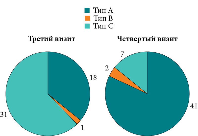 Результаты обследования на четвертом визите, а также сравнительная характеристика результатов обследования на третьем и четвертом визитах отображены в табл. 4 и на рис. 9–12.