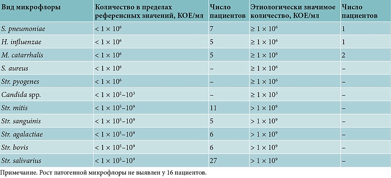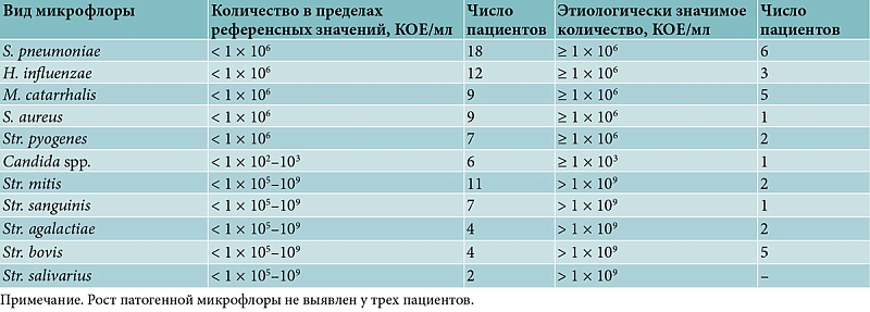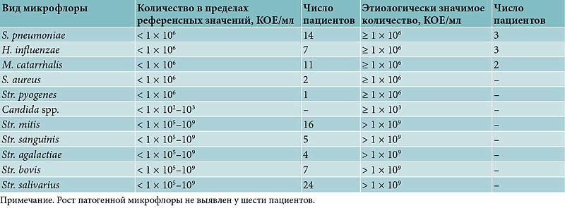 У всех пациентов были проведены эндоскопическое исследование носоглотки и фоторегистрация ее состояния, взяты мазки на микрофлору с поверхности глоточной миндалины и выполнена отомикроскопия. Распределение пациентов с нормальной и патогенной микрофлорой по результатам микробиологического исследования посевов мазков из носоглотки представлено в табл. 1.