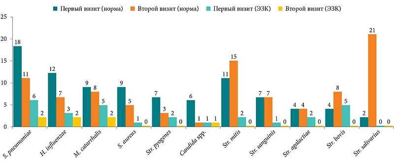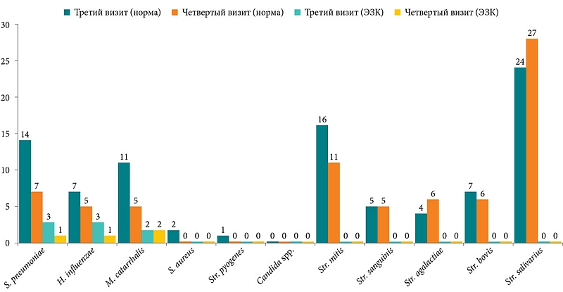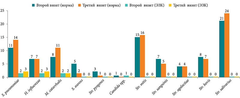 Таким образом, за время от первого до второго визита, по результатам исследований, у пациентов отмечена положительная динамика показателей. После анализа дневников самонаблюдения установлено, что 38 человек отмечали проявления аденоидита, 27 из них – более одного раза. При этом антибактериальная терапия потребовалась только 10 пациентам. При анализе посевов мазков из носоглотки на первом визите рост патогенной микрофлоры не выявлен у трех пациентов, а ко второму визиту число таких пациентов увеличилось до восьми. При этом за прошедшие три месяца отмечено снижение количества патогенных возбудителей при бактериологическом исследовании, частично удалось достичь эрадикации бактерий в этиологически значимых количествах. Одновременно выросло число представителей нормальной микрофлоры носоглотки. Количество пациентов с нормальной тимпанограммой (тип А) увеличилось в три раза, а с тимпанограммой типа В – уменьшилось в 5,5 раза. Отмечено уменьшение средних значений костно-воздушного интервала с 12,55 ± 3,5 дБ до 7,87 ± 3,2 дБ. Кроме того, 12 наблюдаемых за это время не имели клинических проявлений аденоидита.