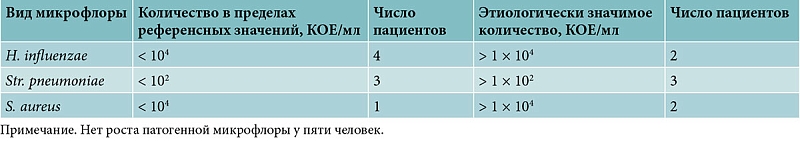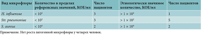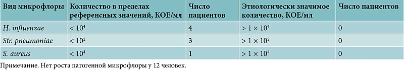 На втором визите был выполнен повторный забор отделяемого из полости носа. Получены следующие данные микробиологического исследования: H. influenzae обнаружены у двух пациентов, Str. pneumoniae – у трех, S. aureus – у одного. При этом у всех пациентов патогенные возбудители высеяны в этиологически незначимых количествах. Не было выявлено роста патогенной микрофлоры в 14 случаях (табл. 6).