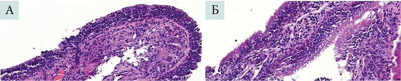 • отсутствие четко дифференцируемых ресничек на апикальной поверхности эпителиоцитов (рис. 2Б).