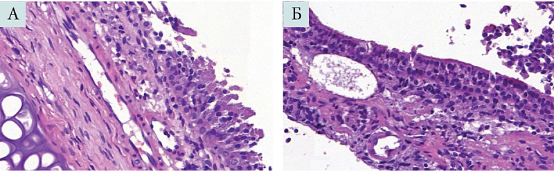 • повышенное содержание бокаловидных клеток в эпителии слизистой оболочки; гиперпродукция слизи, содержащей лимфоциты (рис. 1А).
