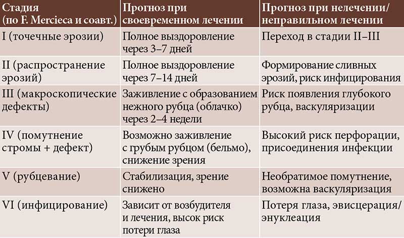 В настоящее время существует несколько подходов к оценке тяжести ЭК. В частности, система, предложенная F. Mercieca и соавт., предусматривает шесть стадий и отражает потенциальные последствия невылеченных повреждений роговицы, обусловленных воздействием ультрафиолета: