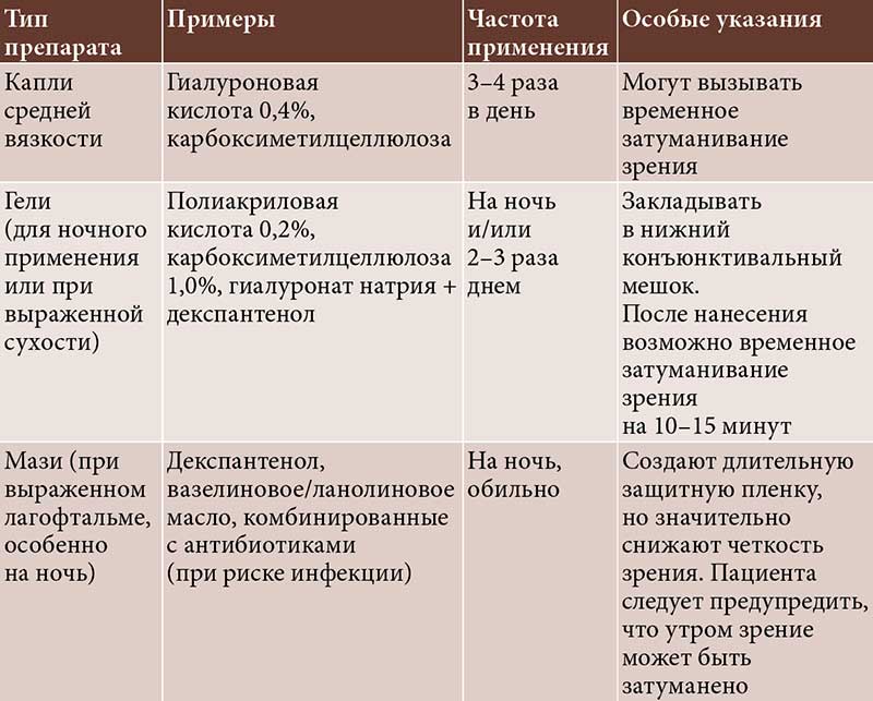 Увлажняющие препараты. На этом этапе применяются определенные увлажняющие средства (табл. 2) [6]. У пациентов с нейротрофической кератопатией, характеризующейся снижением чувствительности роговицы, приоритет отдается препаратам, стимулирующим репаративные процессы. К ним относятся гели с декспантенолом, а также средства с факторами роста (применяются строго по назначению офтальмолога).