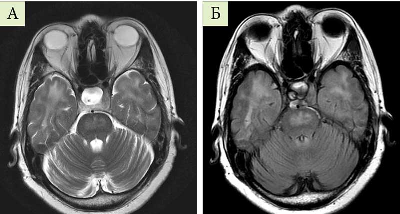 На магнитно-резонансной томограмме (МРТ) головного мозга (ГМ) пациентки с контрастным усилением от 16.03.2021 г.: обнаружены признаки диффузного объемного поражения моста (умеренное объемное увеличение моста, плотность его неоднородно повышена в Т2-, Т2-FLAIR-взвешенных изображениях (ВИ), после введения контраста выявляется его незначительное неравномерное накопление в мосту) (рис. 1).