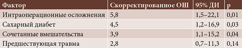 Для определения независимых факторов риска развития эндофтальмита выполнен многовариантный логистический регрессионный анализ. В модель включались статистически значимые переменные из однофакторного анализа. Независимыми предикторами развития эндофтальмита после ТФ ИОЛ оказались: