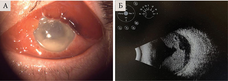 Диагноз эндофтальмита устанавливался на основании клинических признаков: боль, снижение остроты зрения, гипопион, фибринозный экссудат в передней камере и стекловидном теле, а также данных ультразвукового исследования (УЗИ) глаза. Окончательный диагноз подтверждался положительным результатом бактериологического и ПЦР-исследования образцов водянистой влаги и/или стекловидного тела, полученных при выполнении диагностической пункции или витрэктомии (рисунок).