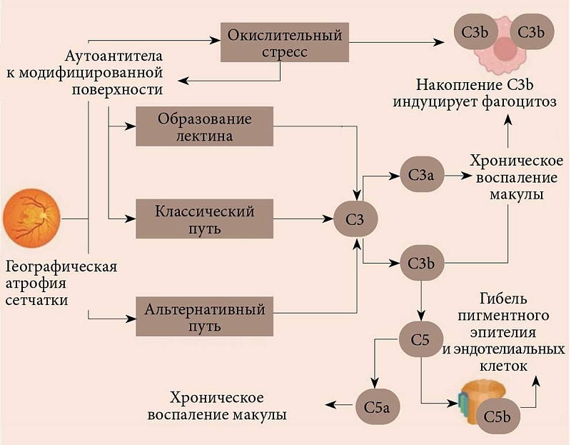 Участие компонентов комплемента в патогенезе заболевания подтверждается накоплением друз между пигментным эпителием сетчатки и мембраной Бруха. Друзы, представляющие собой продукт окислительного повреждения, при избыточном накоплении инициируют хроническое воспаление опосредованно через систему комплемента. Длительно персистирующее воспаление оказывает повреждающее действие на фоторецепторы, пигментный эпителий и хориокапилляры, индуцируя их дегенерацию и последующую атрофию. Ключевую роль в описанных патологических процессах играют фрагменты С3 и С5, обнаруженные в составе друз [19] (рисунок).