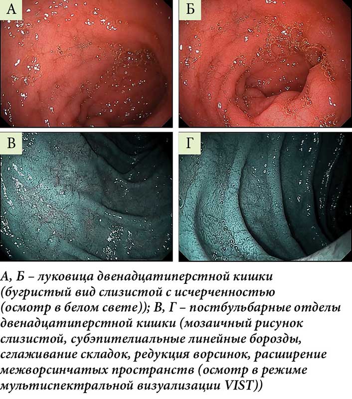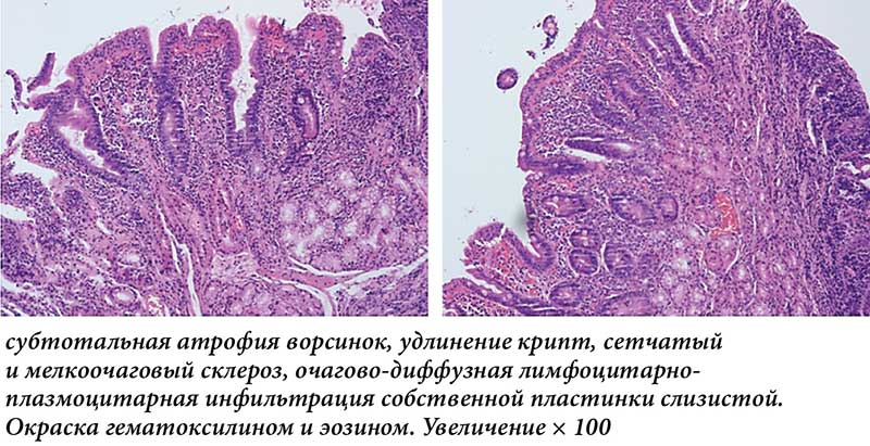 По результатам обследования, отклонений в клиническом и биохимическом анализах крови выявлено не было; по данным ультразвукового исследования органов брюшной полости, без патологий. По результатам лабораторного скрининга на целиакию, получены повышенные титры антител к тканевой трансглутаминазе (IgA и IgG классов); по данным ЭГДС, характер макроскопических изменений слизистой двенадцатиперстной кишки может соответствовать эндоскопическим признакам целиакии с большей степенью выраженности в луковице двенадцатиперстной кишки (рис. 2); выполнена мультифокальная биопсия. Морфологическое заключение: в исследованном материале представлены фрагменты слизистой оболочки двенадцатиперстной кишки с субтотальной атрофией ворсинок и удлинением крипт, сетчатым и мелкоочаговым склерозом, очагово-диффузной лимфоцитарно-плазмоцитарной инфильтрацией собственной пластинки слизистой. Наряду с этим отмечается очаговое, слабо- и умеренно выраженное увеличение числа межэпителиальных лимфоцитов (20–30 на 100 эпителиоцитов). Гистологическая картина хронического дуоденита с субтотальной атрофией ворсинок не противоречит изменениям, характерным при целиакии, стадия Марш IIIB (рис. 3).