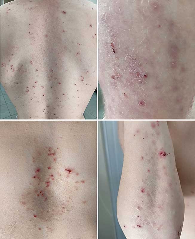 Пациент повторно консультирован дерматологом. С учетом характерных клинических данных: симметричность высыпаний, их локализация, выраженный зуд, ассоциация с целиакией, – установлен диагноз: «дерматит Дюринга (герпетиформный дерматит)». Рекомендована строгая безглютеновая диета, комплексное медикаментозное лечение кожных проявлений и зуда.