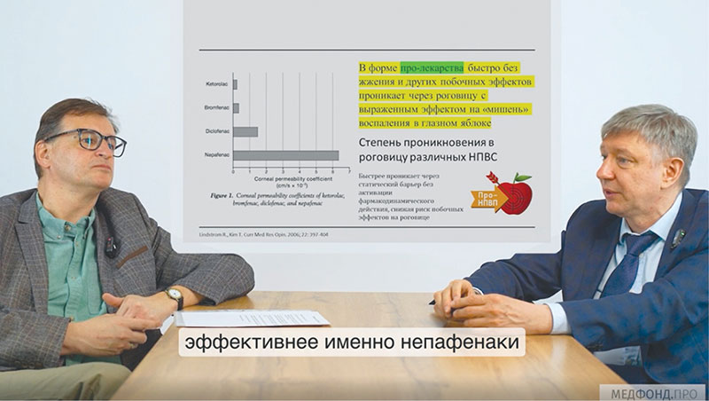 На современном фармацевтическом рынке представлен широкий выбор НПВП для офтальмологического применения. Особый интерес представляют препараты, характеризующиеся высокой степенью проникновения в ткань роговицы. Непафенак – предшественник активной формы НПВП с противовоспалительным и анальгезирующим действием. Непафенак в форме пролекарства (проНПВП) быстро, без жжения и других побочных эффектов проходит через роговицу и с выраженным эффектом фокусируется на мишени воспаления в глазном яблоке. Благодаря своим свойствам непафенак быстрее проникает через статический барьер, который представляет собой роговица, без активации фармакодинамического действия, снижая риск нежелательных эффектов. Исследования продемонстрировали, что непафенак имеет преимущество перед другими НПВП в скорости проникновения через роговицу глаза и по показателям безопасности10.