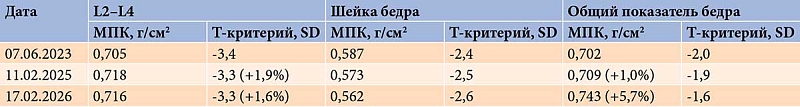 Следующая DXA была проведена 17 февраля 2026 г., то есть через год от начала внутривенного введения ибандроновой кислоты (препарата Резовива). Установлено, что МПК в L2–L4 (L1 исключен из анализа из-за остеосклероза) достигла 0,716 г/cм2 (+1,6%) (Т-критерий – -3,3 SD), в шейке бедра – 0,562 г/cм2 (Т-критерий – -2,6 SD), в общем показателе бедра – 0,743 г/cм2 (+5,9% относительно исходного измерения, +4,9% относительно предыдущего измерения) (Т-критерий – -1,6 SD).