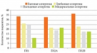 При изучении профиля сенсибилизации к неинфекционным аэроаллергенам достоверных межгрупповых различий установлено не было. Ведущую позицию в профиле детектируемых аллергенов занимала бытовая сенсибилизация, которая была выявлена у 36% пациентов ГИ. На грибковую сенсибилизацию приходилось 24% случаев, на эпидермальную сенсибилизацию – 23%, на сенсибилизацию к различным пыльцевым аллергенам – 15% случаев. Данные профиля сенсибилизации по группам исследования представлены на рис. 1.