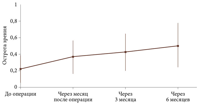 До операции всем пациентам измеряли остроту зрения (корригированную и некорригированную), проводили рефрактометрию, биометрию для расчета оптической силы ИОЛ, тонометрию, биомикроскопию и офтальмоскопию. Остроту зрения оценивали по десятичной шкале (Snellen эквивалент). Рефракция выражалась в виде сферического эквивалента (СЭ). Уровень внутриглазного давления (ВГД) > 21 мм рт. ст. считался повышенным. О повышенном уровне ВГД свидетельствовала также потребность в гипотензивной терапии.