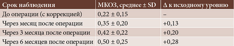 Уже через месяц наблюдалось значительное улучшение остроты зрения по сравнению с исходным уровнем (рис. 1). МКОЗ через месяц составила в среднем 0,35 ± 0,20, а через три месяца – 0,42 ± 0,22. К шестому месяцу от момента операции средняя МКОЗ достигла 0,50 ± 0,25, что значительно превысило исходные показатели (p < 0,001). Иными словами, в среднем зрение улучшилось с 0,22 до 0,5 (в 2,3 раза). Улучшение зрения происходило в основном в первые три месяца после хирургического вмешательства. Между третьим и шестым месяцем различия были незначительны (прирост 0,08; p = 0,07). Некорригированная острота зрения (НКОЗ) также возросла благодаря оптимальному положению и рассчитанной оптической силе ИОЛ: к шестому месяцу НКОЗ в среднем составила 0,32 ± 0,20 (для сравнения: до операции большинство пациентов без коррекции не различали даже крупные объекты из-за смещения хрусталика). Доля пациентов с функционально значимым зрением (МКОЗ ≥ 0,5) увеличилась с 10% до операции до 58% к шестому месяцу после нее (p < 0,001). При этом 84% пациентов достигли МКОЗ ≥ 0,3 (табл. 1).