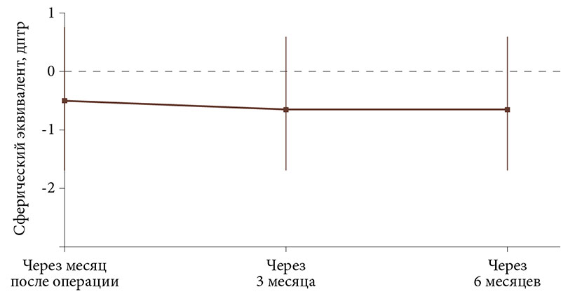 Особого внимания заслуживают рефракционные результаты после фиксации ИОЛ. Оптическую силу ИОЛ рассчитывали по формуле SRK-II, целевой рефракцией во всех случаях была эмметропия. Фактически к первому месяцу после операции средний СЭ составил 0,50 ± 1,2 дптр, к трем месяцам – -0,60 ± 1,1 дптр, к шести – -0,65 ± 1,0 дптр. Таким образом, наблюдалась тенденция к небольшому миопическому смещению рефракции (в среднем на -0,5–-0,7 дптр), что объяснялось незначительным наклоном или смещением ИОЛ в отдельных случаях, а также возможной гиперметропической погрешностью при расчетах оптической силы ИОЛ у пациентов с отсутствием хрусталика. Разница среднего СЭ между первым и шестым месяцем была статистически незначима (-0,15 дптр; p = 0,36), что свидетельствовало о стабильности рефракции после первичного периода адаптации. На рисунке 2 представлена динамика средней рефракции: уже через месяц был достигнут результат, близкий к целевому. В дальнейшем существенных сдвигов не зафиксировано.