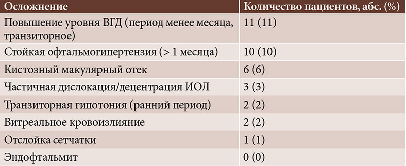 В раннем послеоперационном периоде (первые 7–10 суток) у большинства пациентов наблюдалась ожидаемая воспалительная реакция: у 28% она проявлялась значимой реакцией со стороны радужки (иридоциклит 1–2-й степени) с клетками в передней камере, требовавшей интенсификации стероидной терапии, однако через две недели у всех пациентов воспаление успешно купировалось. У 11 (11%) пациентов в первые дни после операции регистрировалось повышение уровня ВГД > 25 мм рт. ст. вследствие стероидного ответа или пигментации трабекулы. Во всех случаях ВГД нормализовалось консервативно (на фоне назначения местных бета-блокаторов и ингибиторов карбоангидразы в течение 2–4 недель). Транзиторная послеоперационная гипотония отмечалась у 2 (2%) пациентов: давление снизилось до 5–6 мм рт. ст. в первый день после операции из-за негерметичного склерального отверстия. Оба случая успешно скорректированы дополнительным швом, на итоговое состояние глаза это не повлияло.