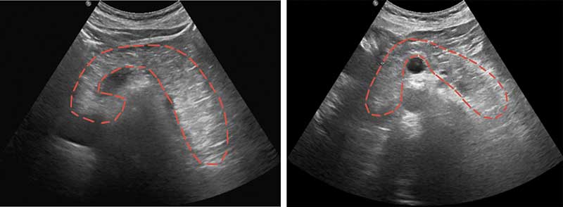 Согласно данным ультразвукового исследования брюшной полости, контуры поджелудочной железы неровные, нечеткие, структура паренхимы диффузно неоднородная, эхогенность аналогичная эхогенности жировой клетчатки. Главный панкреатический проток не расширен (рис. 1).