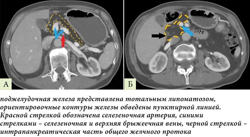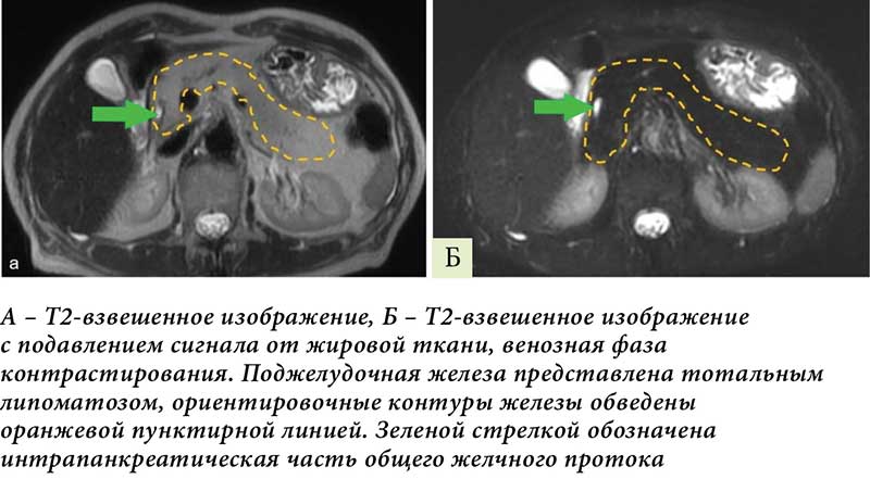В клинической практике и медицинской литературе феномен липоматозной псевдогипертрофии (ЛПГ) нередко обозначают ярким метафоричным термином «исчезающая» поджелудочная железа. Этот термин отражает феномен кажущегося отсутствия поджелудочной железы (ПЖ) при визуализационных исследованиях. ЛПГ ПЖ – это крайне редкое доброкачественное заболевание неизвестной этиологии, впервые описанное немецким патологоанатомом Вальтером Хантельманном (Walther Hantelmann) в 1931 г. [1]. Заболевание характеризуется экзокринной недостаточностью ПЖ вследствие локальной или диффузной замены ацинарных клеток жировой тканью при отсутствии признаков атипии, воспаления или фиброза и с сохранением панкреатической протоковой системы и островков Лангерганса [2]. ЛПГ ПЖ представляет собой самостоятельную нозологическую единицу, этиологические механизмы и патогенез которой окончательно не ясны. Тем не менее с ЛПГ ассоциируют некоторые редкие врожденные заболевания: синдромы Швахмана – Даймонда, Йохансона – Близзарда, Баннаяна – Райли – Рувалькабы, кистозный фиброз (муковисцидоз). Синдром Швахмана – Даймонда – редкое мультисистемное генетическое заболевание, наследуемое по аутосомно-рецессивному типу, характеризующееся изменениями костного скелета, дисфункцией костного мозга, липоматозом поджелудочной железы [3]. Синдром Йохансона – Близзарда – редкое аутосомно-рецессивное заболевание, характеризующееся аплазией/гипоплазией ПЖ, аномалиями развития носа и скальпа, нейросенсорной тугоухостью, задержкой умственного и физического развития [4]. Синдром Баннаяна – Райли – Рувалькабы – редкая генетическая патология с аутосомно-доминантным типом наследования, характеризующаяся множественным подкожным и висцеральным липоматозом, ангиоматозом и макроэнцефалией [5]. Муковисцидоз, также известный как кистозный фиброз, – это тяжелое наследственное аутосомно-рецессивное заболевание, характеризующееся прогрессирующим поражением легких и экзокринной недостаточностью поджелудочной железы вследствие фиброзно-жирового перерождения ее ткани, вызванного закупоркой протоков густым секретом [2, 6, 7]. Помимо врожденных, были предложены различные гипотезы приобретенных состояний, вызванных инфекционным или токсическим воздействием или являющихся следствием обструкции протоков ПЖ, ведущей к атрофии паренхимы и ее жировому замещению [2, 7, 8].