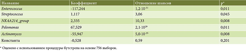 где χ1 – уровень Enterococcus; χ2 – уровень Streptococcus; χ3 – уровень NK4A214_group; χ4 – уровень Pelomonas; χ5 – уровень Actinomyces; e – основание натурального логарифма.