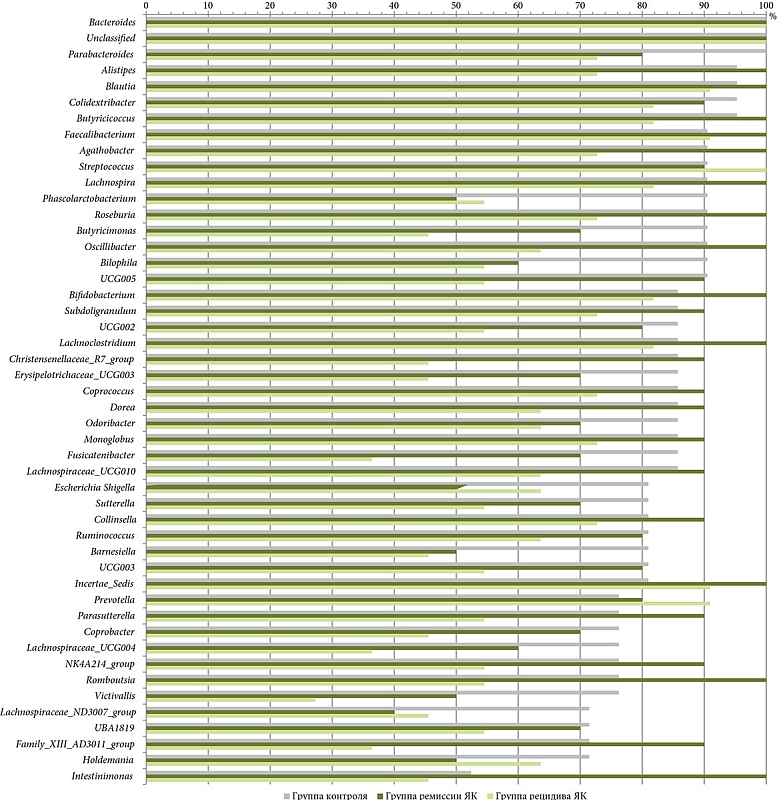 На уровне рода у всех участников из контрольной группы регистрировались Bacteroides, Unclassified и Parabacteroides. Alistipes, Blautia, Colidextribacter, Butyricicoccus обнаруживались у 95,24% обследуемых, остальные – в меньшем числе случаев. У 100% пациентов в группе рецидива обнаруживались роды Bacteroides, Unclassified и Streptococcus; у 90,9% – Faecalibacterium, Prevotella, Blautia, Pelomonas, Incertae Sedis. У всех пациентов группы ремиссии регистрировались 15 родов бактерий: Bacteroides, Unclassified, Faecalibacterium, Alistipes, Bifidobacterium, Lachnospira, Agathobacter, Lachnoclostridium, Blautia, Roseburia, Oscillibacter, Butyricicoccus, Romboutsia, Incertae Sedis и Intestinimonas. Представленность наиболее часто встречающихся родов микроорганизмов в группах отражена на рис. 2.